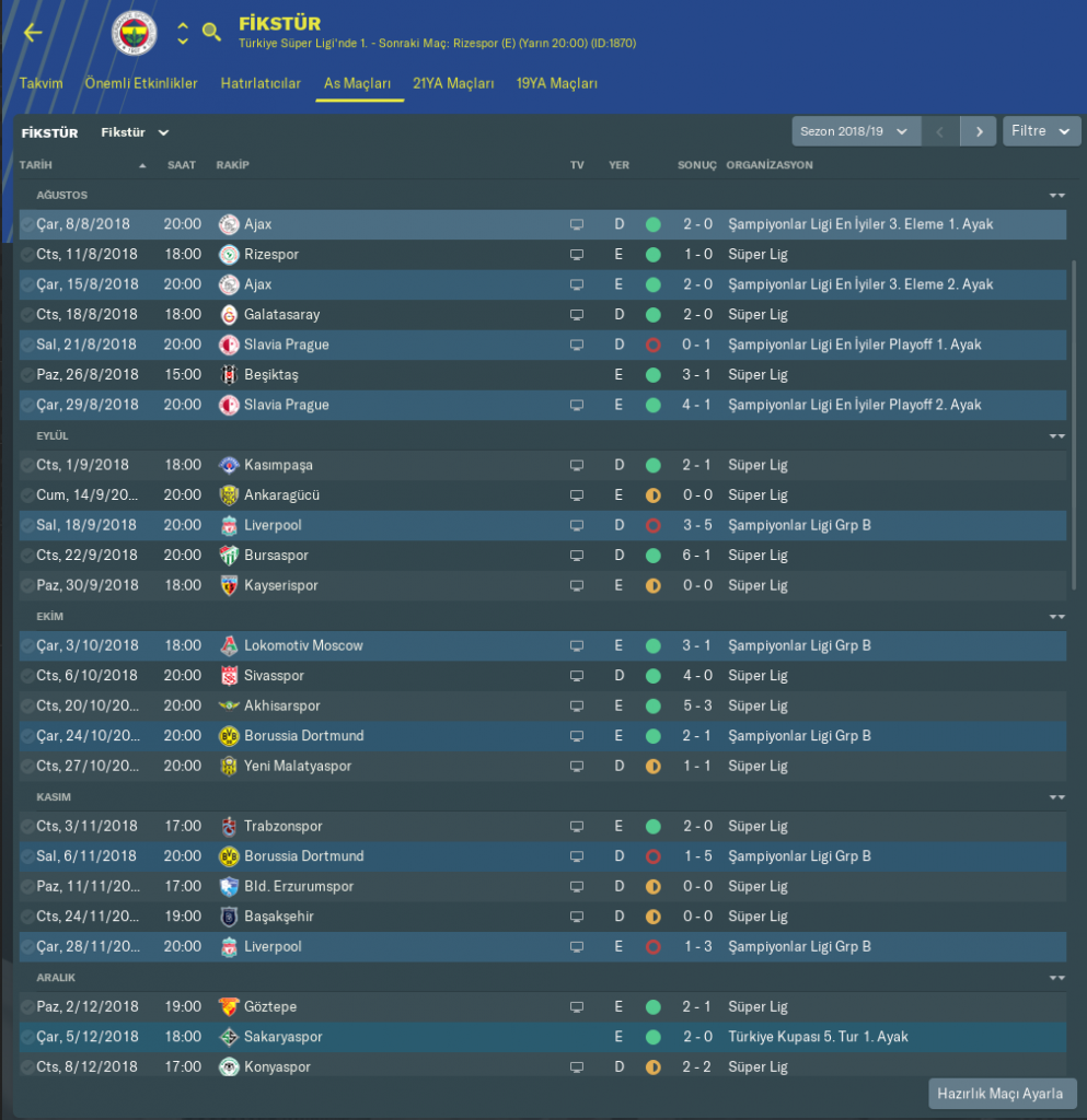 FM 2019’da taktik ekranını baştan sonra değiştiği için öncelikle fark ettiğim en önemli şey takıma sürekli hücum oynatmaya çalıştığım zaman az gol atıp kalemde çok gol görmem oldu. Arzuladığım hücum futbolunu oynatmak için büyük bir transfer bütçesine ihtiyacım var ama Fenerbahçe’nin de bütçe konusunda durumu belli. İşte bu yüzden takımımı daha az eforla ve daha az riskle sahadan nasıl galip çıkarırım düşüncesi üzerine yoğunlaştım. Taktiğim olabildiğince az riskle maksimum verim almayı amaçlıyor ve ilk sezonumda mücadele ettiğim 3 kulvardan 2’sini kazanmam başarılı olduğumu gösteriyor.