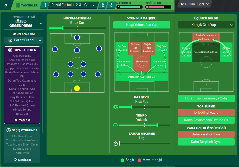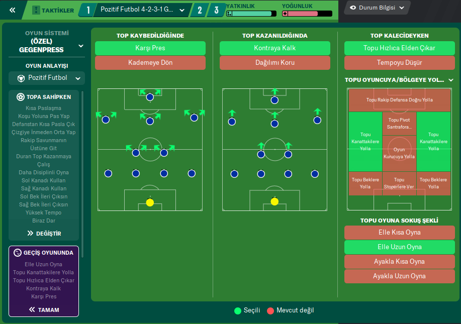 Geçiş oyunu bölümünde top kaybedildiğinde kimin ne yapacağı, kazanıldığında ne yapılacağı, top kaleciye geldiğinde ne yapılacağı ayrı ayrı belirlenebiliyor ki burası gerçekten üzerinde düşünmeniz, küçük küçük oynamanız gereken alan. Benim taktiğim gereği top kaybedildiğinde çılgınca bir baskı, alan markajı, kazanıldığında hızla kontraya kalkma şeklinde ilerliyorum. Top kalecimdeyken de başlangıçta uzun oynamıyordum ancak ilk sezon kısa oynarken yediğim saçma sapan goller sonrası bunu anında terk ettim. Kalecime elle uzun ve kanatlara oynamasını istedim.
