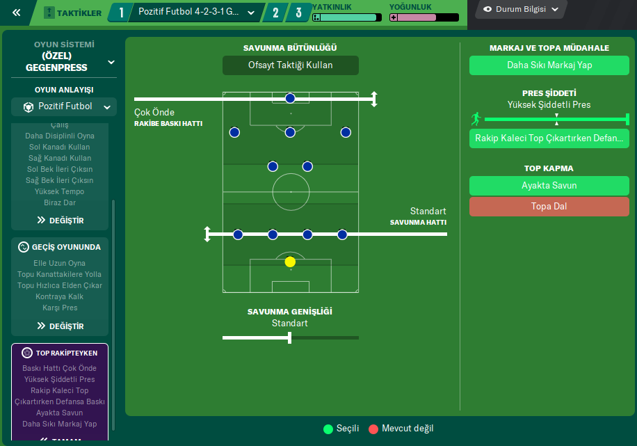 Top rakipteyken geçiş oyununda da bahsettiğim üzere önde rakibe baskı, savunma hattını öne taşıyarak takım boyunu kısaltma genel talimatlarım. (Defansı öne kurmam ve zaman zaman ofsayt taktiğini kullanmadaki başarısızlık arkaya uzun top atan takımlara karşı can sıkıcı goller yememe sebep oldu o sebepten defans hattını standart boyuna çektim.)