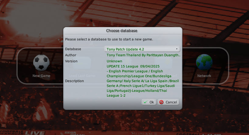 - Football Manager 2008’e giriş yapın ve yeni oyun açın. Yeni oyun açılış ekranında database seçim ekranında Tony Patch Update 4.2’ü seçin.