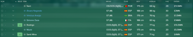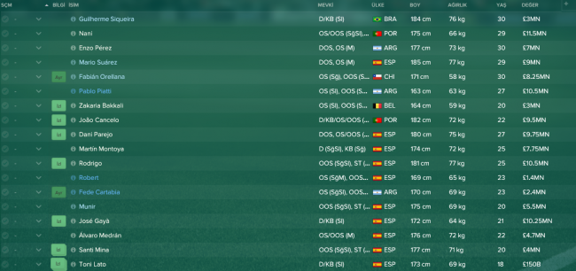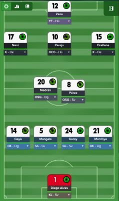 Orta sahanın merkezinde Enzo Perez ve Dani Parejo oynatılabilir. Yedek olarak Medran, Suarez gibi oyuncular bulunmakta. Sağ kanatta Orellena sol kanatta Nani’yi kullanabilirsiniz. Kanatlarda Munir, Bakkali, Rodrigo, Mina gibi seçeneklerde bulunuyor.