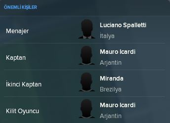 Takım kaptanı Mauro Icardi, onun yokluğunda kaptan Miranda olacak. Takımın kilit ismi aynı zamanda takım kaptanı olan Mauro Icardi olacak.