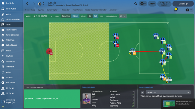 Kanat beklerimizi görev talimatlarını hücum olarak seçiyoruz bu sebeple alacağınız ya da bu pozisyonda oynatacağınız oyuncuyu buna göre seçmeniz gerekiyor. Kanat beklerimiz hücum ağırlıklı bir oyun oynayacağımız için aynı zamanda hızlı hücumlarımız da kanat bindirmelerimiz de bizim için kilit rol oynayacaktır.