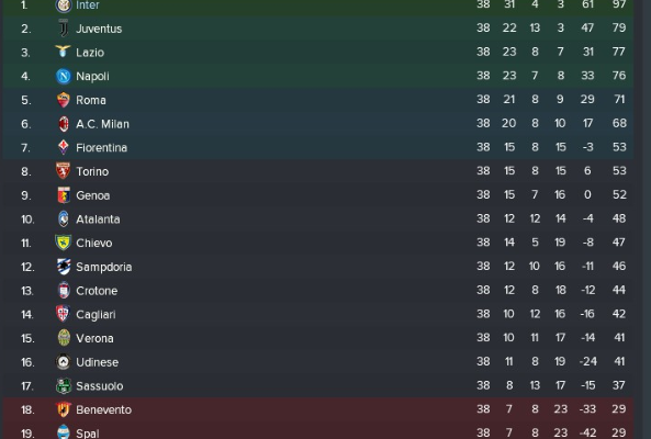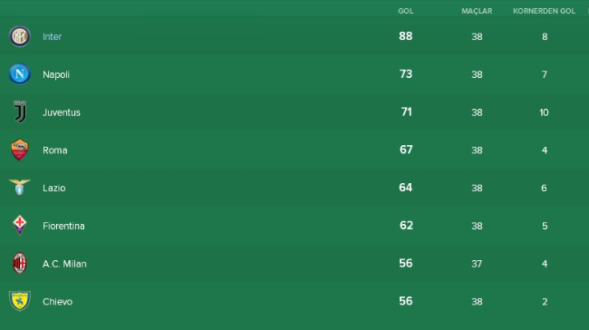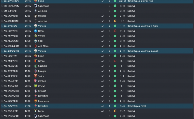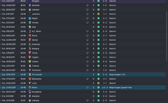 Taktiğimiz sahaya Juve’nin 6 yıllık hegemonyasını dağıtarak yansıdı. Ligin yanı sıra kupayı da kaldırarak ikide iki yaptım ve süper bir sezon geride bıraktım. Takım Avrupa kupalarında yer almadığı için biraz rahat bir sezon oldu. Az maç, az stresle ilerledik. Sezon genelinde başarılı olduk. Juve ile iki maçta da 1-1’lik skorlarla berabere kaldık. Milan’ı iki maçta da yendim. Sezon genelinde 3 mağlubiyet aldım, evimde aldığım tek mağlubiyet ise ezeli rakip Napoli’ye karşıydı. Bu bayağı canımı acıttı. Sezon genelinde rakiplerimi iki farklı skorlarla yendim. 3-1, 2-0, 4-2 sürekli alınan skorlardı. Buradaki genel özet ise taktiğimiz sahaya oldukça iyi yansıdı ve bana ligde 97 puan gibi muazzam bir puan kazandırdı. Juve, sezon genelinde arkamdaydı ama son 7/8 haftaya girilirken çok hata yaptılar ve sezon sonu gelmeden şampiyon olmayı başardım. Sezon sonunda ise Juve’yi görmem için dürbün gerekiyordu. 🙂