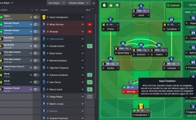 Taktiğin ana felsefesi hücum gibi görünse de aslında presçi bir takım da oluşturarak rakiplere çok zor anlar yaşatıyorsunuz. Takımın orta saha üçlüsü artı kanat bekleri de oyuna girince orta saha bir an 5’li oluyor. Top rakipteyken ikinci bölgede rakibi fena sıkıştıyorsunuz, bu sayede erken top kapıp karşı atağa geçebiliyorsunuz. Orta sahada bulunan futbolcularınızdan birisi ‘Ofansif Oyun Kurucu’ görevi ile siz kontraya çıkarken hücum bölgenizi milimetrik paslarıyla besliyor. Bunu benim takımımda Oğuzhan Özyakup üstlendi. 🙂 Sezon başında orta sahamdaki sıkıntı nedeniyle 5 M E gibi cüzzi bir miktara alıp, Ozzie’yi tam anlamıyla 150 M’luk adam yaptım. :)) Orta sahama inanılmaz bir efektiflik kattı. Taktikte hem kanat beklerin hemde kanat hücumcuların aynı anda hücuma katılması işe muazzam bir hücum zenginliği sağlıyor. Bir anda ceza sahası içinde 5/6 futbolcu ile pozisyona girme şansınız doğuyor. Forvetiniz de İcardi olunca kanatlardan taşınan topların önemi bir kat daha artıyor. Kanatlardan da bu kadar top taşınması İcardi’nin daha rahat gol kralı olmasını sağladı. Özetle; taktiğimiz hem pres açısından hemde hücum zenginliği açısından oldukça verimli. Rakibi önde karşılayıp kontralarla da gol bulabilirsiniz yada hücuma topyekün gibi kalkıp da gol bulabilirsiniz.