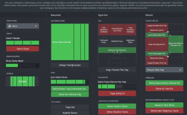 Direktiflerin açılışı kontrollü ve akıcı oyun. Böylece oyunun gidişatına göre takımınız reaksiyon gösteriyor. Genelde kontrol sizin elinizde bulunuyor. Savunma çizgisini daha önde tutarak rakipleri ikinci bölgenin sonunda karşılıyorum. Üçüncü bölgeye tam girmeden kanat bekler ve defans çizgisinin ilerde olması nedeniyle rakip hücumcular direkt duvara çarpmış gibi geri dönüyor. Pas düzenini ise daha fazla dikine oyna diyerek ileriye, kanatlara daha anahtar pas atarak hücum futbolcularımı daha net pozisyona sokabiliyorum. Bu nedenle orta sahada vizyonu ve tekniği yüksek futbolcularının olması önemli. Defanstan kısa pasla çık, rakip ceza sahasına paslaşarak gir gibi talimatlar artık benim için klasikleşmiş talimatlar. Her taktikte o direktifler işe yarıyor. Genel anlamda bu direktifler takımın hücum gücünü ve pres gücünü arttırıyor. Zaten taktiğimizin felsefesi de pres ve hücum oyunuydu. Bu taktik adına bu direktifler biçilmiş bir kaftandır.