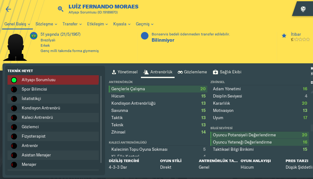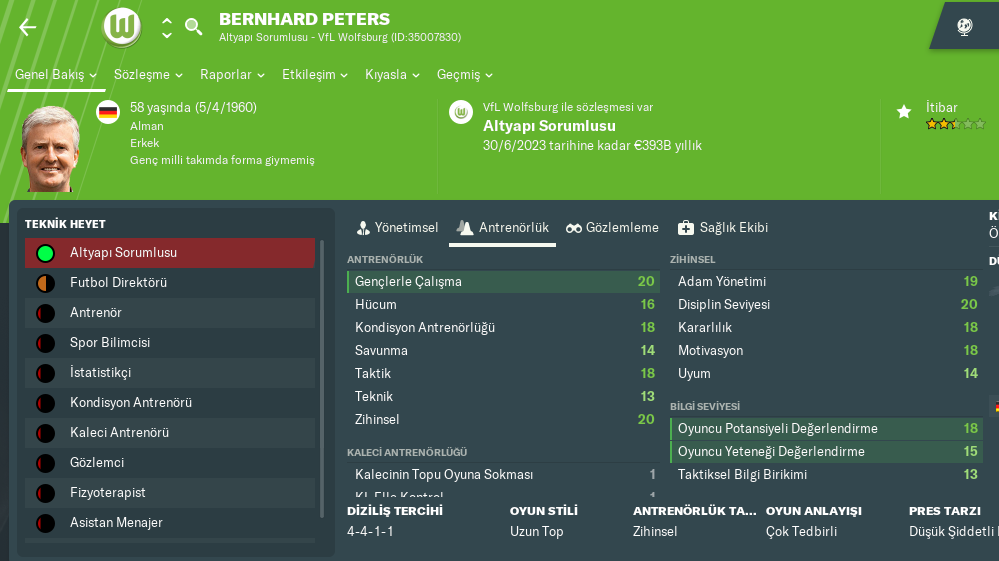 Oyun başında işsiz olması onu altyapının başına getirmeniz için büyük bir avantaj olabilir. Ben Wolfsburg kariyerinde altyapıyı ona emanet ettim. Tabi Alman olması, ligi bilmesi de seçimimdeki diğer faktörlerdi. Hoş bunlar olmasa bile aşağıdaki profile bakınca her türlü alınır diyebiliriz zaten 🙂