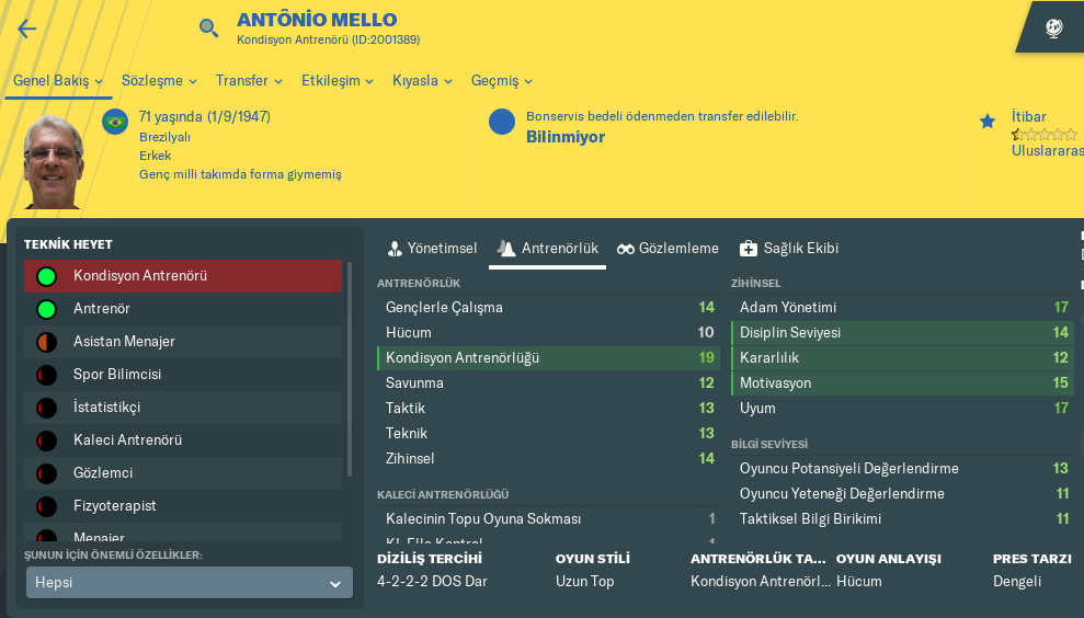 Yine bir Brezilyalı ve bakın şu şansa ki o da takım çalıştırmıyor. 71 yaşındaki yaşlı kurt Antonio Mello’yu çalışmaya ikna edebilirseniz, hiç durmayın.