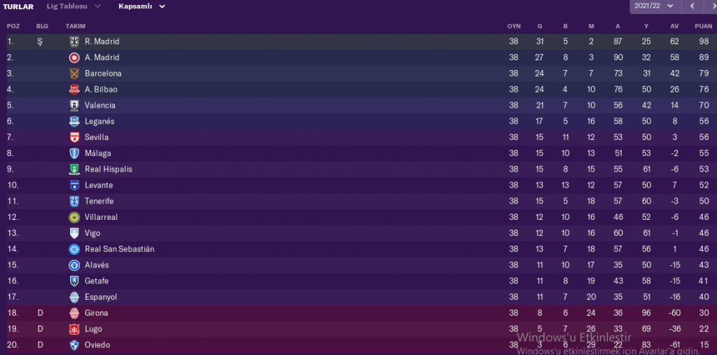 Bu süreç içerisinde Barselona ve Real Madrid’i evimizde 2-1 ve 1-0 skorlar ile devirmiştik. Sezon boyunca harika bir performansımız vardı aslında. Toplamda üç mağlubiyetimiz bulunuyordu fakat sekiz beraberlik şampiyonluk şansımızı yitirmişti. Real Madrid (d), Malaga, Villareal deplasman ve içeride, Alaves (d), Sevilla (d), Vigo (d), Espanyol (d)..