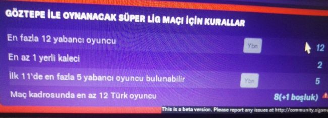 FM 2019 Beta öncesinde “Kupada oynayan 3. Lig ve BAL takımları için kadro kuralları düzeltilirken Süper Lig ve 2. Lig bozulmuş ve farklı liglerin kuralları birbirine girmiş.” bu yüzden Süper Lig ve 2.Lig takımlarında “İlk 11’de en fazla 5 yabancı oyuncu bulunabilir” uyarısı şu anda Football Manager 2019’da alınıyor.