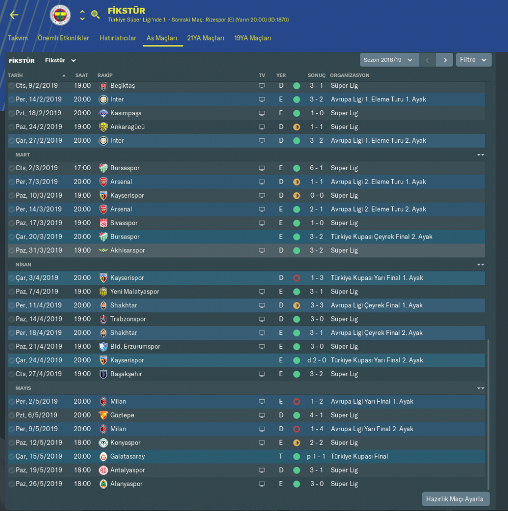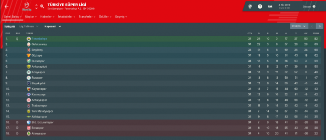 FM 2019’da taktik ekranını baştan sonra değiştiği için öncelikle fark ettiğim en önemli şey takıma sürekli hücum oynatmaya çalıştığım zaman az gol atıp kalemde çok gol görmem oldu. Arzuladığım hücum futbolunu oynatmak için büyük bir transfer bütçesine ihtiyacım var ama Fenerbahçe’nin de bütçe konusunda durumu belli. İşte bu yüzden takımımı daha az eforla ve daha az riskle sahadan nasıl galip çıkarırım düşüncesi üzerine yoğunlaştım. Taktiğim olabildiğince az riskle maksimum verim almayı amaçlıyor ve ilk sezonumda mücadele ettiğim 3 kulvardan 2’sini kazanmam başarılı olduğumu gösteriyor.
