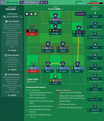 Solu KF (Hücum), sağı ise K (destek) şeklinde kullanmamın sebebi kadromdan maksimum verim almak istememdi, siz o bölgeleri kendi takımınıza göre düzenleyebilirsiniz. İlk sezonumda solda kanat forvet olarak oynayan Ayew takıma inanılmaz bir katkı sağladı. Yeri geldiği zaman 1’e 1 oyunlarla adam geçerek güzel goller attı, yeri geldi yaptığı alan açmaları sayesinde Slimani ve Benzia’ya gol imkanı tanıdı.