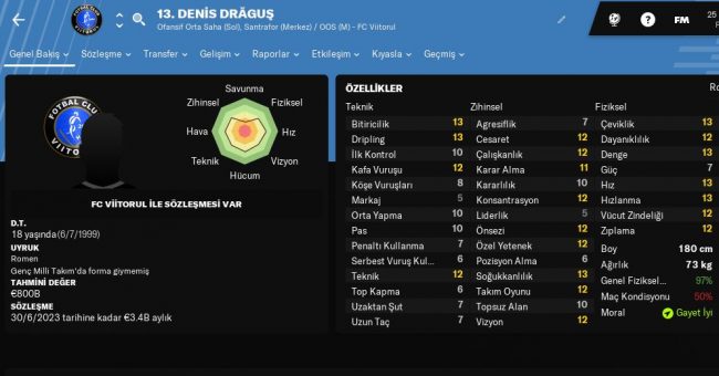 18 yaşında, forvet mevkisinde oynuyor, Rumen takımı Viitorul’da forma giyiyor. Hızlı ve driplingi iyi, sol kanatta da forma giyebilir. Bitiriciliği 13, yaşına göre gayet makul bir seviye. Hızlı, bitirici bir forvet görüntüsünde. Ayrıca zihinsel olarak da iyi. Soğukkanlı, kaleci ile başbaşa kaldığı zaman yada baskı altındayken hata yapma olasılığı az. 1.80 boyu var ama zayıf, güçsüz fiziği var. İkili mücadelelerde bu bir dezavantaj. Ayrıca, kararlılığı da düşük. Antrenmanlarda kendini geliştirmesi biraz zor olabilir. Yine bu iki dezavantajı göz ardı ettirecek bir yeteneğe, potansiyele sahip. Maliyeti, 0.75 M €.