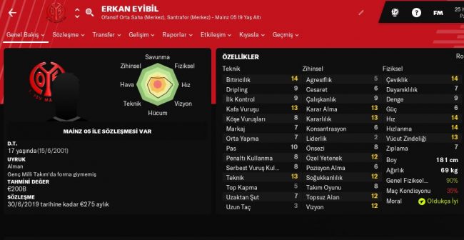 17 yaşında, Mainz’de forma giyen gurbetçi futbolcumuz. Orta sahanın kanatlarda dahil her yerinde forma giyebilir. Öyle bir hıza ve yeteneğe sahip. Bernardo Silva, İsco yada Coutinho’ya benzettim bu özelliğini. Çünkü saydığım futbolcularda öyle. Pas, teknik, duran topları oldukça iyi. Zeki de futbolcu, vizyonu iyi seviyede. Ana mevkisi ofansif orta saha olduğu için bu özelliklerinin iyi olması, oyuncunun çok potansiyelli olduğunu gösteriyor. Özel yetenek, dripling, orta açma gibi özellikleri de iyi. Kanatlara da koysanız sırıtmadan forma giyer. Türk pasaportu da olması, Türk takımları çalıştıran FM severler için büyük avantaj. Maliyeti, 0.7 M €.