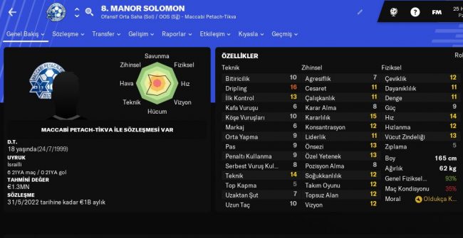 18 yaşında, Maccabi Tikva’da forma giyiyor. Listedeki tüm futbolculardan daha çok maç tecrübesine sahip, çünkü 16 yaşından beri sürekli takımında forma şansı buluyor. Kanatlarda forma giyiyor. Dripling, hız, teknik özellikleri iyi seviyede. Yaşı 18 ama driplingi 16, bu oldukça iyi bir seviye. Zihinsel özellikleri de iyi, takıma katkısı çok olabilir. Kararlılığı, 15. Antrenmanlarda bunun katkısını görebiliriz, kendini iyi geliştirir. Avrupa’nın çoğu takımında oynayabilir. Maliyeti, 1 M € civarında.