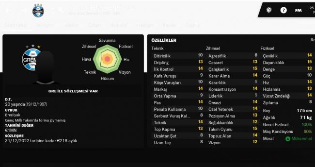 20 yaşında, Gremio’da forma giyiyor ve tam bir joker. Stoperden, forvete kadar o uzun koridorun her yerinde oynayabilir. En güçlü olduğu bölgeler; defansif orta saha ve orta saha. Stoperde de çok rahat oynayabilir, hatta oyun anlayışınız pas oyunu ise geriden oyun kurmanıza çok yardımcı olacaktır. Pasör stoper olarak kullanıp; markaj, top kapma, ön sezi, pozisyon alma, teknik, pas vs. gibi özelliklerinden yararlanmanız mümkün. Oyuncunun bu saydığım özellikleri yaşına göre çok iyi seviyede. Defansif orta sahada da, orta sahada da oynasa takımına müthiş katkılar sağlar. Potansiyeli yüksek, hem kesici, hem de teknik bir isim. Tek dezavantajı, kararlığı düşük. Bu da antrenmanlarda verimsiz olmasına neden oluyor. Maliyeti, 4.2 M €’yu bulabilir.