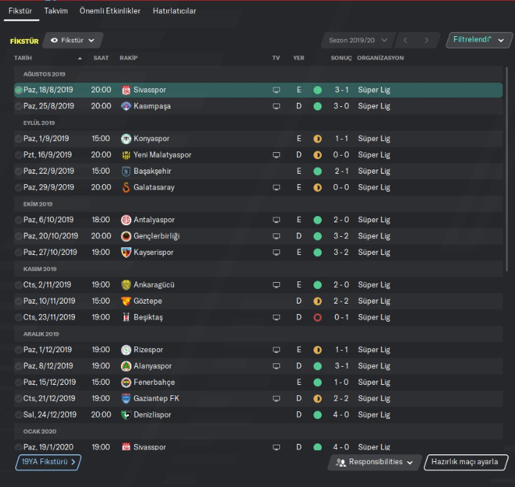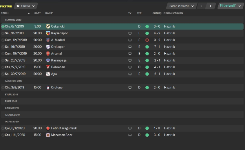 Sezon öncesi kampı ile birlikte yoğun bir hazırlık maçı fikstürü de ayarladım. Bunun sebebi az önce yukarıda da belirttiğim gibi hem kondisyondan hem de futbolcuların taktiğe daha çabuk uyum sağlamasını sağlamak. Futbolcular birbirleriyle ne kadar çok maç yaparsa, takım içi kimya ve taktik tahtasındaki kimya da o derece artıyor. Artık oyunun bu yönleri çözdük çünkü. 24 günlük süreçte 8 maç oynattım takıma. Bunun sebebi takımı Avrupa Ligi’ne hazırlamak için. Sonuçta perşembe ve pazar günleri maça çıkacak bu takım 2 gün arayla 2 maç şeklinde. Bende bu yoğun tempoya hazırlamak için yoğun bir kamp dönemine soktum resmen takımı. Bazı FM oyuncuları için sezon öncesi önemsiz gözükebilir ama ciddi anlamda önem taşıyor sezon öncesi kampları. Naçizane tavsiyem sizde sezon öncesi kamplarını sıkı bir şekilde tutun. Sezon öncesinde bahsettiğim gibi 8’i 24 gün içinde olmak üzere 9 karşılaşma yaptım ve 8 galibiyet aldım. Tek mağlubiyetim Atletico’ya karşı oldu. Sağlam hazırlık maçları çıkarttık.