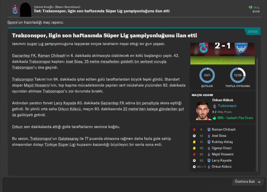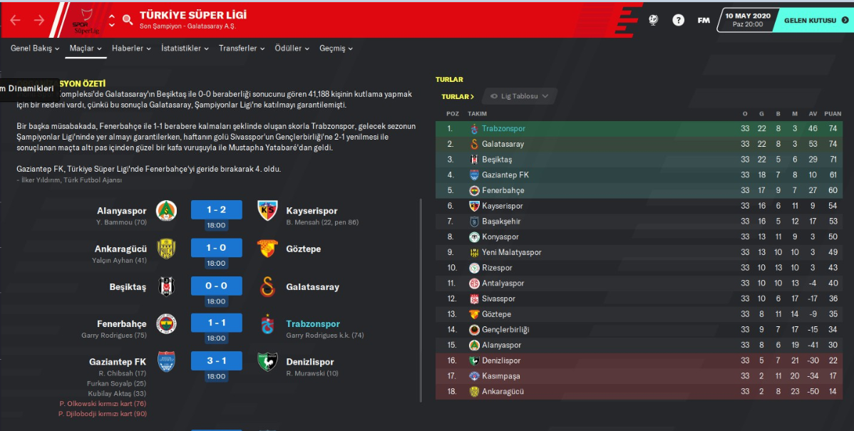 Son haftada evimde ligin iyi takımlarından Gaziantep FK ile oynayacaktım. Hata şansım yoktu, maçı kazanmak; şampiyonluğu kazanmak demekti. Maçta yapacağımız her şeyi yaptık, harika bir tempo ile rakibe top göstermeden tek kale futbol oynadık üstelik her şeyde lehimize gidiyordu, rakip 6. dakikada 10 kişi kalmış, 43’de öne de geçmiştik ama saçma sapan bir penaltı ile dakika 83’de gol yedik. Bu andan sonra ”gitti ulan tüm sezonun emeği” derken, aynı anda var gücümüzle de yüklenmeye devam ediyorduk. Artık her şey tam bitti derken, 90+3’de 18 yaşındaki bir çocuk 22 metreden şampiyonluğu getiren harika golü atmış, sezonu dramatik bir şekilde ”şampiyon” olarak tamamlamıştık. İnanılmaz bir sezon, inanılmaz bir maçla bitmişti. Galatasaray’da bizimle aynı puanda ligi bitirmesine rağmen, ikili averajda onlardan üstün olduğumuz için biz şampiyon olduk.