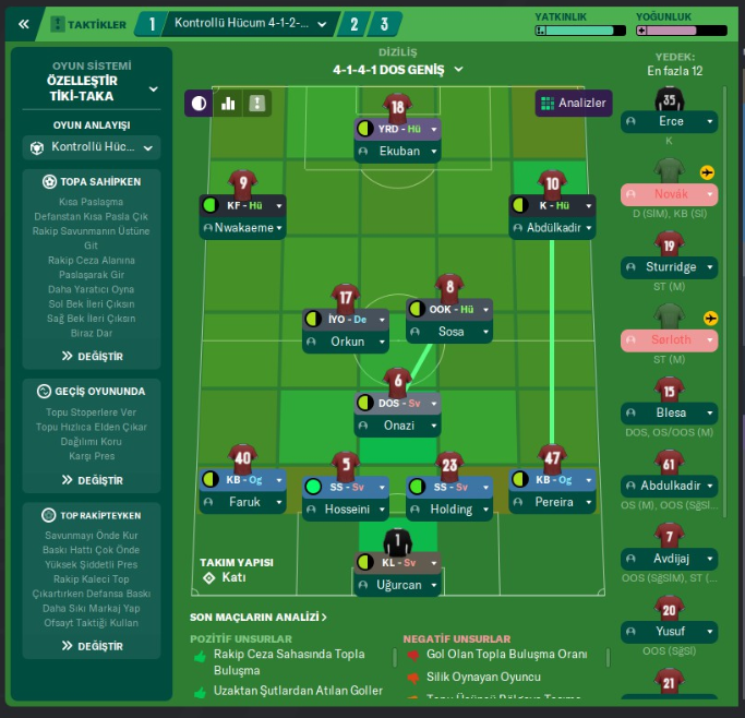 Sahaya yayılış şeklimiz 4-1-2-3 şeklinde, sezon başında takımı böyle başlattım, sezon bitene kadar da kolay kolay vazgeçmedim bu taktikten. Bu taktiğin avantajı ve dezavantajı bir hayli çok. Bunları bu taktiği özel bir şekilde yazdığımda daha çok detaylandıracağım. Şimdilik sadece taktiğin üzerinden sizlere anlatım sunacağım. Taktik de oyun sistemi olarak ”özelleştirilmiş tiki taka” yazıyor. Yani kendi oluşturduğum bir sistem. Kısa paslar yapma, dar alanda ve oyunun boyunu kısaltarak oynamak, rakip ceza alanına paslı girme, daha yaratıcı ve kreatif oynama, beklerin ileri çıkması gibi komutlara sahibiz; topa sahipken. Bu komutlar için öncelikle teknik kapasitesi yüksek oyunculara ihtiyacımız var ki çünkü kısa paslı bir oyun ve yaratıcı bir oyun oynuyoruz. Kısa paslı, dar alanda oynanan oyunda teknik kapasite önem arz ediyor çünkü direkt olarak rakibi delmeye çalışmak yerine boşluklar arama derdindeyiz. Burada da teknik ve futbolcunun vizyonu, zekası devreye giriyor. Orta sahada Sosa gibi bir adam olunca bu problem hemen çözülüyor. Bir diğer orta sahamızın yani ”iki yönlü’‘ oynayacak olan adamımızın ise biraz daha dinamo tarzında, fiziksel yönü kuvvetli bir adam olması tercihimiz. Çünkü Sosa tamamen oyunu tek yönlü oynarken, o diğer tüm her yere koşmak, bir nevi takımın orta sahasında nefer olmak durumunda. Dinamizm ve tekniği orta sahanın merkezine yerleştirmek, bu taktikte muazzam işe yarıyor. Beklerimizin ise, ofansif açıdan ve dayanıklılık açısından iyi olması gerekiyor. Bekleri ileri çıkart komutunu verince kanatlarda aynı anda 4 adam birden atağa çıkmış oluyor. Ofansif açıdan çok zengin bir durum olsa da geride geniş açı bıraktığımız için çoğu zaman bu komut nedeniyle atak üstüne atak yiyoruz. O yüzden bazen çok tehlikeli olabiliyor bu komut.