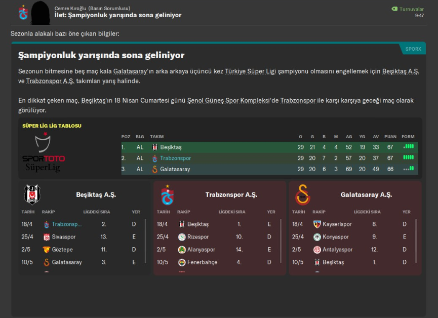 Kasım ayı gelince de yine biraz sıkıntı çektim ama takım biraz daha oturduğu için, artık oyun anlamında daha az sorun çıkıyor, tek problem skora gitme oluyordu. Bir Beşiktaş maçında da bu gözler önüne serildi. Beşiktaş’a karşı deplasmanda harika futbol oynamama rağmen maalesef 1-0 kaybettim maçı. Zaten 3 İstanbul takımıyla yaptığım maçlarda sadece ilk devrede Beşiktaş’a kaybettim. Fener’i evimde 1-0 yendim, Galatasaray ile ise 0-0 berabere kaldım. İlk devre sonunda 10 galibiyet, 6 beraberlik, 1 mağlubiyet aldım. Aslında bakıldığı zaman Türkiye standartlarında hiç fena bir tablo gibi gözükmüyor ama öyle bir Galatasaray ve Beşiktaş vardı ki ilk devrede, ligi hallaç pamuğu gibi attılar. Özellikle Galatasaray, attığı 43 golle dosta düşmana korku veriyordu. Ne yalan söyleyeyim işimin zor olacağını hatta şampiyon olamayacağımı bile düşünmeye başlamıştım çünkü oturması gereken taşlar bir hayli fazlaydı. Lider, otoriter bir stoper gerekliydi. Hossieni ve Hüseyin çok potansiyel vaat etseler de henüz çok gençlerdi. Orta saha merkez de Abdulkadir Parmak her maç üst düzey oynayamıyordu. Merkez de eksiğim vardı. İki üç transfere ihtiyacım vardı ve o transferleri yapmaya kararlıydım.