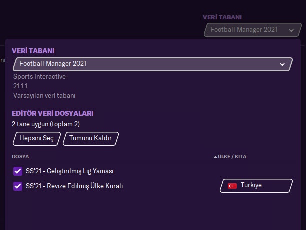 - Revize edilmiş kurallarla Football Manager 2021’i oynamak istiyorsanız veri tabanı seçim alanında SS’21 Geliştirilmiş Lig Yaması ve SS’21 Revize Edilmiş Ülke Kuralları dosyalarını seçin ve kopyalayın.