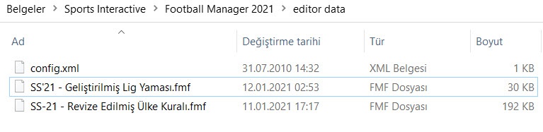 İndirmiş olduğunuz Football Manager 2021 SS’21 rar dosyasını klasöre çıkartın. Klasörden çıkan 4 tane .fmf dosyasındam kullanmak istediklerinizi C: / Users / “username” / Documents / Sports Interactive / Football Manager 2021 / editor data içine kopyalayın. (Belgelerim\Sports Interactive\Football Manager 2021\editor data)