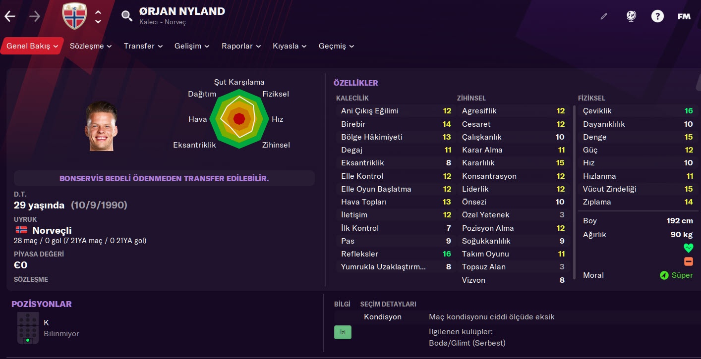 Nyland, Aston Villa Championship’ten çıkarken kalesinde görev alan kalecilerden biriydi. Norveçli eldiven geçen sezon ise Premier Lig’de pek forma şansı bulmadı. Nyland ortalama bir kaleci profilinde ama İngiltere gördüğünden dolayı bir ihtimal ortalama bir kaleciye göre daha yüksek bir maaş talep edebilir. Nyland takımınız durumuna göre bir yada ikinci kaleci olabilir.