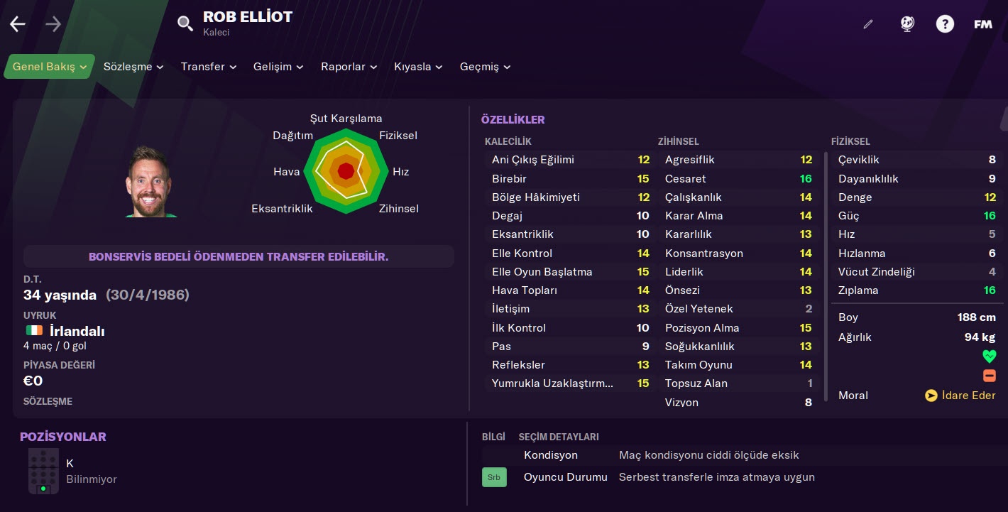 İrlandalı usta file bekçisi, yıllarca İngiltere’de birinci yada ikinci kaleci olarak görev aldı. 34 yaşında olmasından dolayı yine kısa vadede iş görebilecek kalecilerden birisi olarak listede dikkat çekiyor. Süper Lig’de yada farklı liglerde bir takımınıza kaleci lazım olursa Rob Elliot’a bakmanızı tavsiye edebilirim.