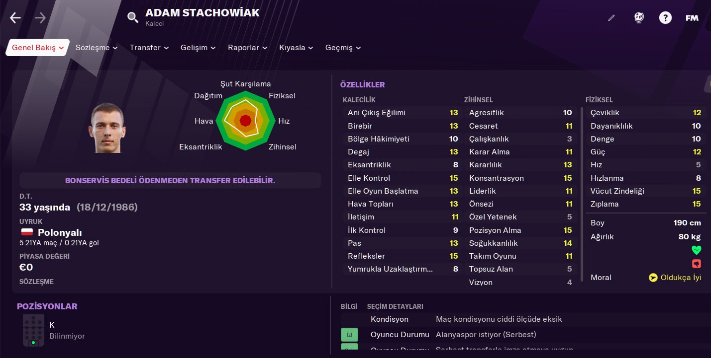 Stachowiak, pandemiden sonra Denizlispor’dan hemen ayrılmıştı. Yıllarca TFF 1.Lig izlediğimiz ve ardından Süper Lig’de iyi işler başaran Stachowiak’ı taraflı tarafsız herkes beğenmişti. Hâlâ nasıl boşta kaldığını anlayabilmişte değilim açıkçası. Polonyalı file bekçisi iyi bir kaleci profilinde, kalenizi gözü kapalı güvenebilirsiniz ve bu da Warner gibi, topu oyuna sokma konusunda başarılı bir kaleci.
