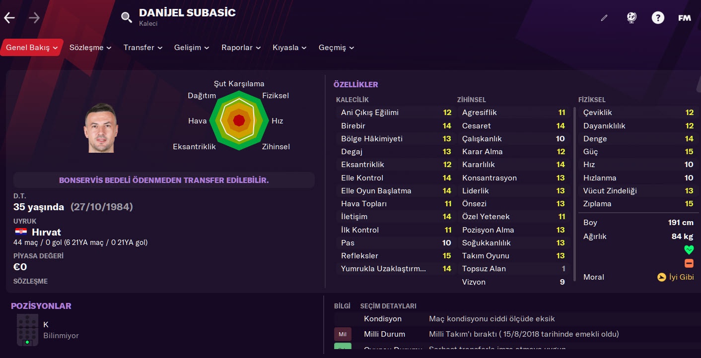 Subasic yıllarca Monaco ile beraber üst düzey turnuvalarda boy göstermiş bir kaleci. Yaşından dolayı sanırım bu sene sözleşme uzatmadılar. Süper Lig’de hâlâ iş yapabilir, birinci kaleci yada yedek kaleci olarak aslında çoğu ligde iş yapabilir. 35 yaşında olmasından dolayı kısa vadede takımınıza kazandırabilirsiniz. Hırvat kalecinin, hem Milli Takım tecrübesi hem de kulüp takımları tecrübesi üst seviyede ve henüz kalecilik meziyetlerini de kaybetmiş değil.