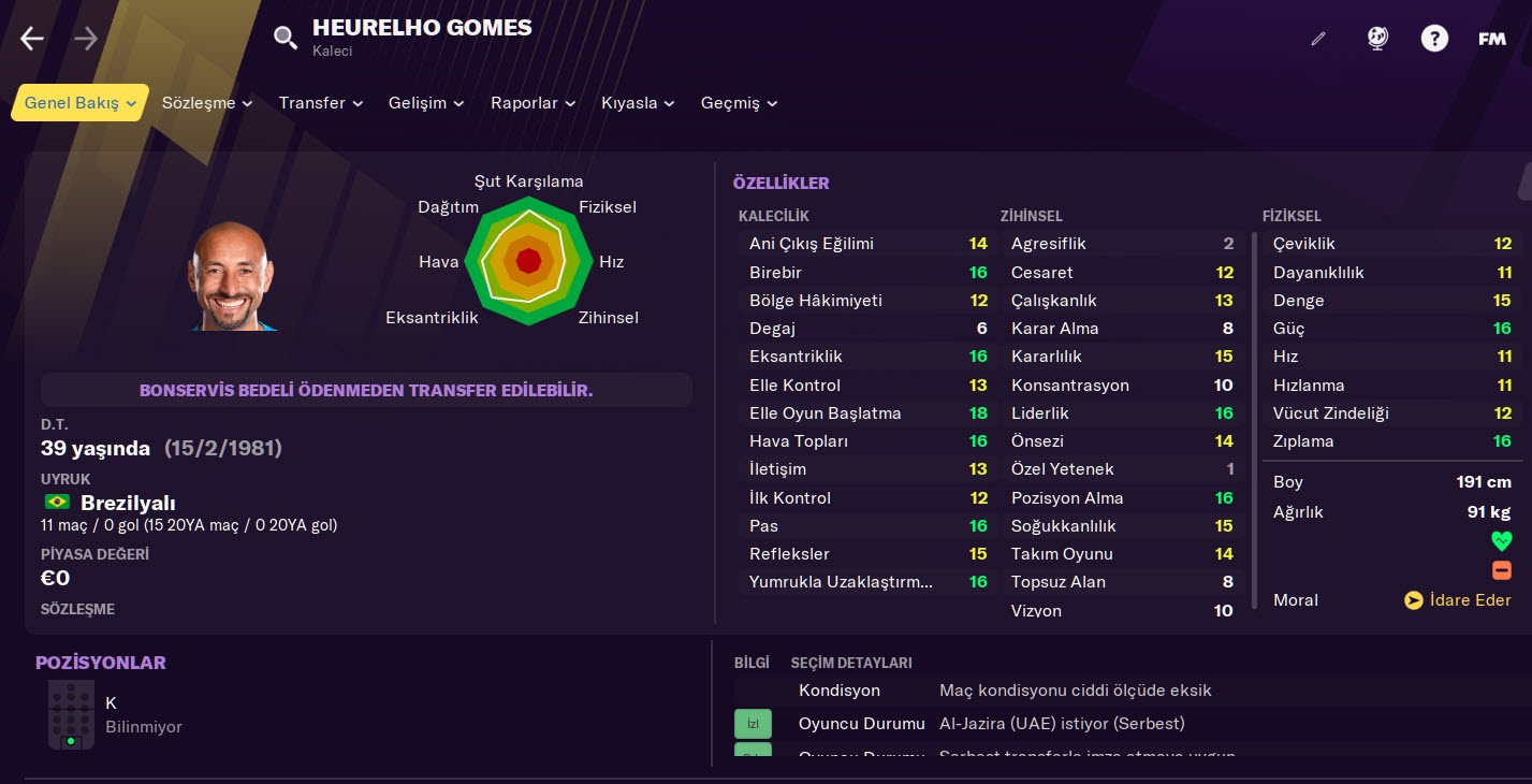 Yıllarca Premier Lig’de boy göstermiş olan Gomes, bu sezon başında Watford tarafından serbest bırakıldı. 39 yaşına gelmiş olan fakat hâlâ kalecilik meziyetleri çok iyi olan Gomes, kısa vadeli bir transfer olarak kullanılabilir yada ikinci bir kaleci olarak takımınızda iş görebilir.