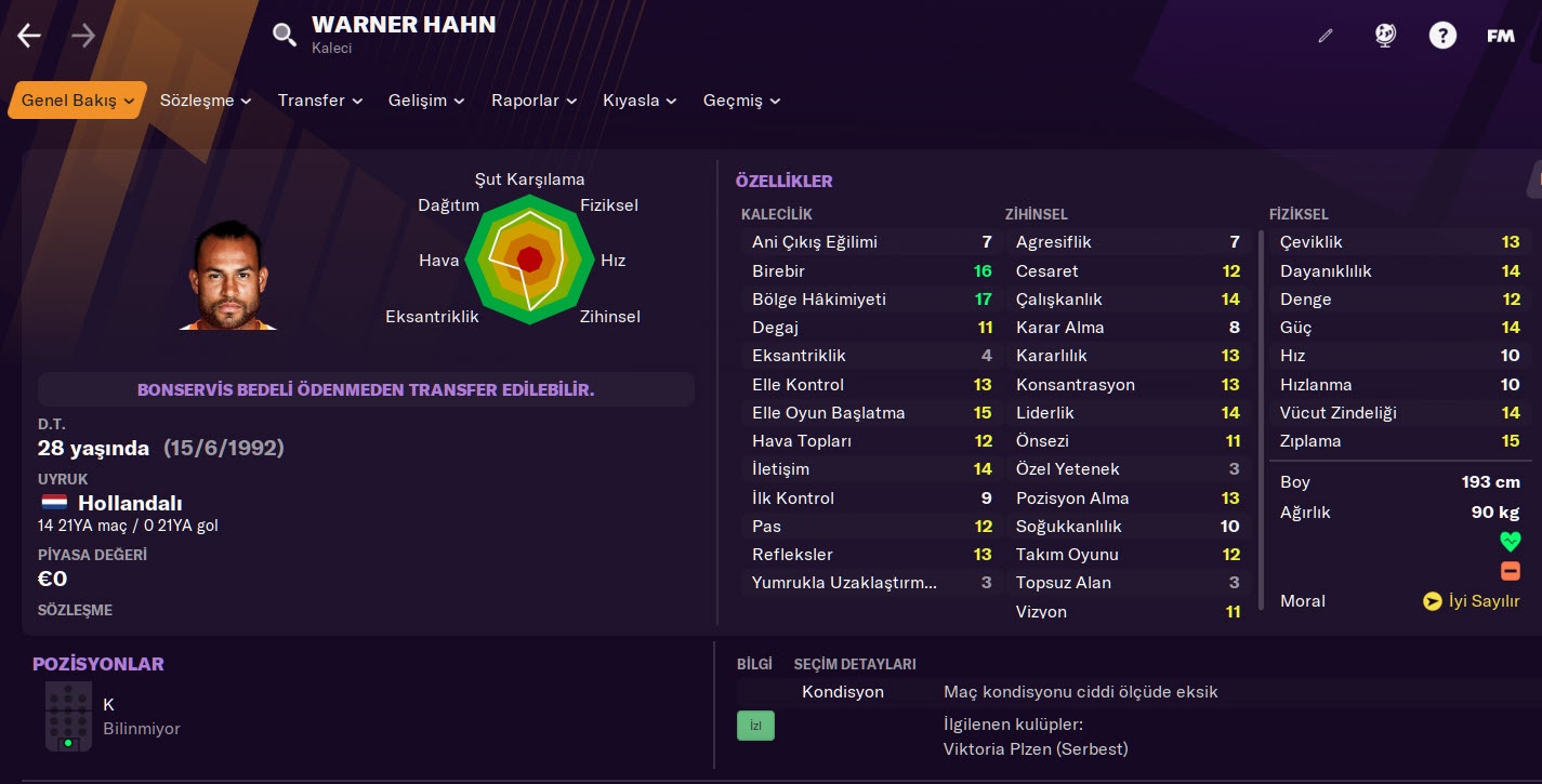 Hollanda’nın dışına çıkmamış olan Warner’ın en dikkat çekici özelliği, birebir de başarılı olması. Warner, modern futbolun istediği düzeyde de topu oyuna sokabiliyor ve teknik meziyetleri de iyi. Yani pas oyununuzu kaleden başlatıyorsanız bu konuda Warner’a güvenebilirsiniz. Warner’ın tek eksisi refleksleri. Uzaktan gelen şutlarda sorun yaşatabilir ama yine de ucuz profilde olan ve Süper Lig’de işinize yarayabilecek bir kaleci.
