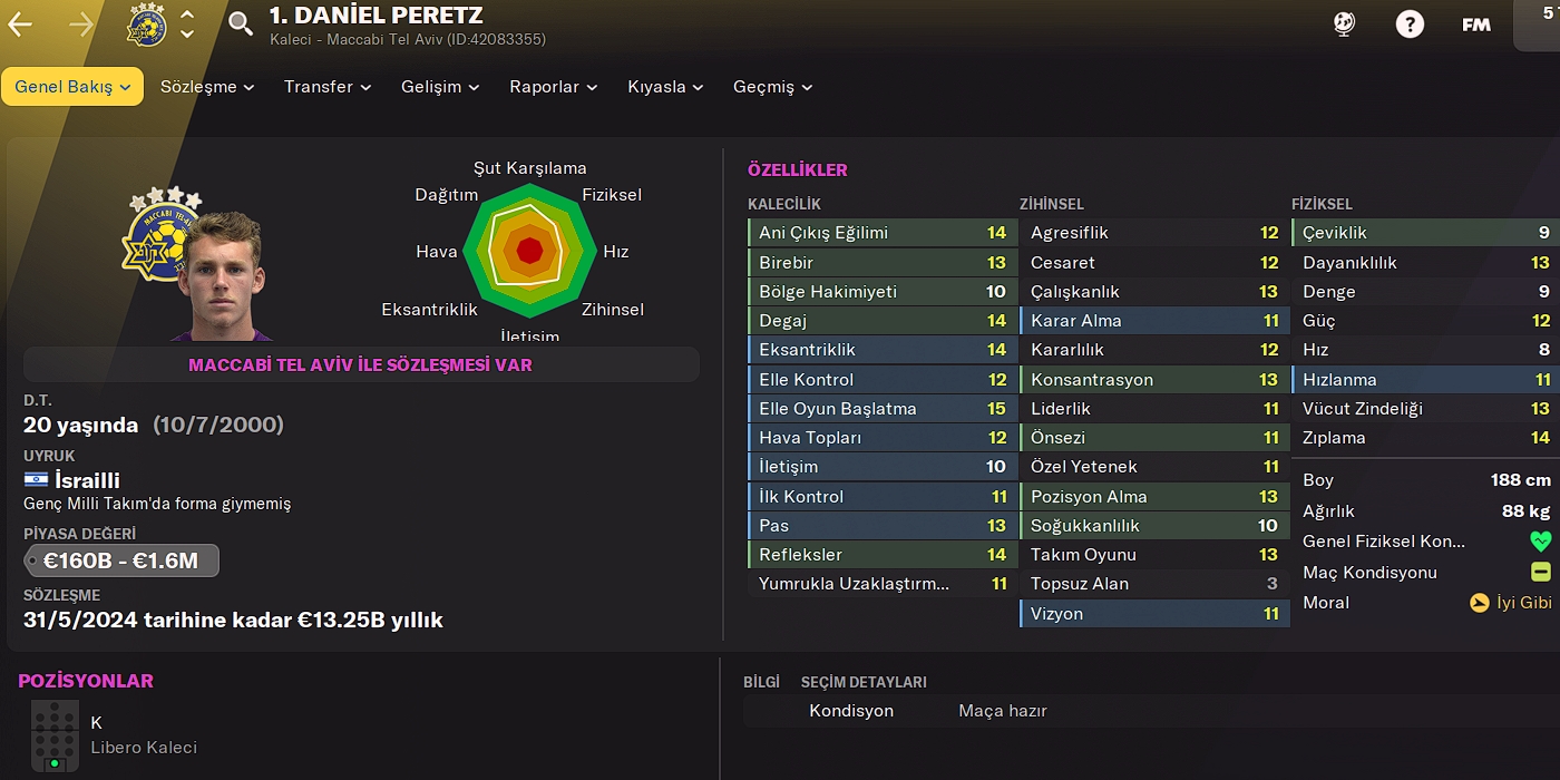 Daniel Peretz teknik ağırlıklı profiliyle göz dolduran bir kaleci, yaşına rağmen pas, elle oyun başlatma ve degaj konusunda iyi bir seviyede, oyuncunun en bariz dezavantajları Çeviklik ve Soğukkanlılık olarak göze çarpıyor.