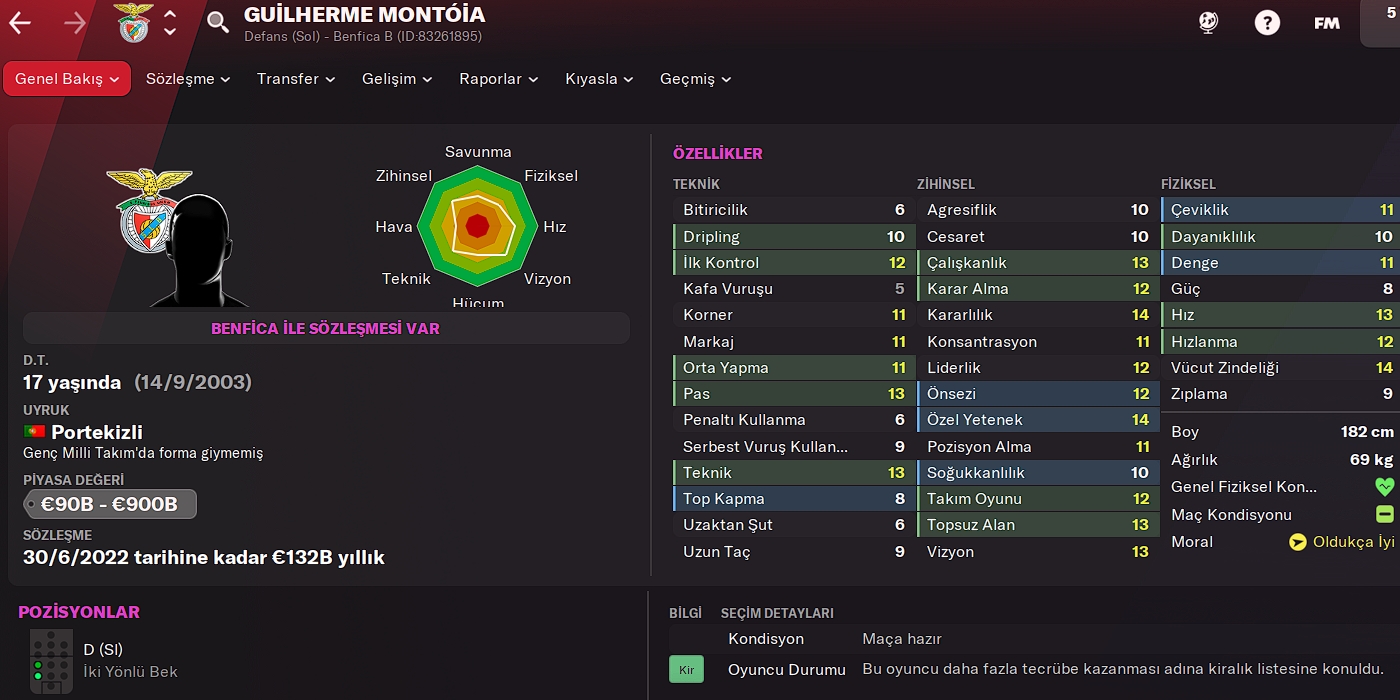 Guilherme Montoia pas, teknik, özel yetenek ve topsuz alan özellikleriyle hücum yönü güçlü bir bek, oyuncunun en bariz dezavantajları uzun taç, güç ve zıplama olarak göze çarpıyor.