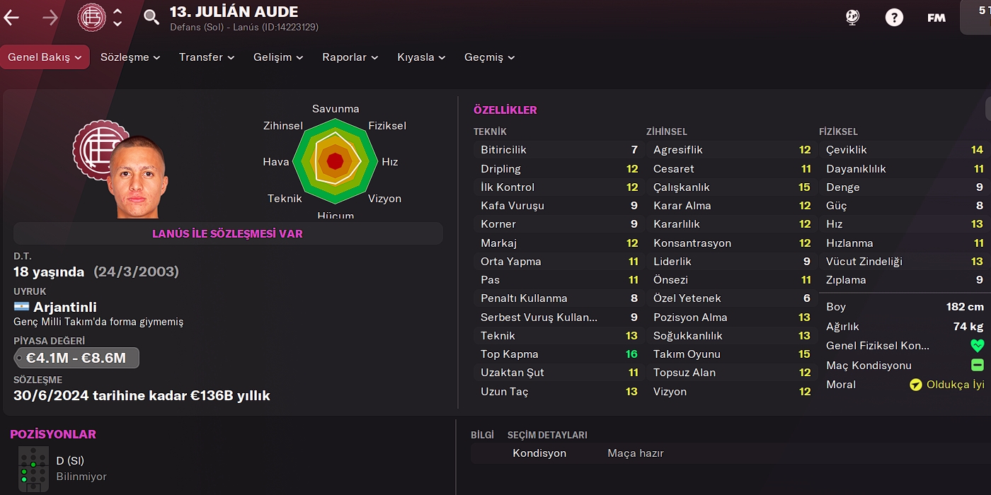 Julian Aude top kapma, pozisyon alma ve soğukkanlılık özellikleriyle savunma yönü güçlü bir bek, oyuncunun en bariz dezavantajları güç, denge ve zıplama olarak göze çarpıyor.