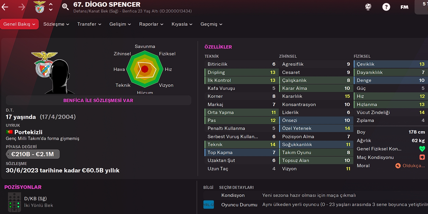 Diogo Spencer çabukluğu ve üretkenliği ile aşırı hücumcu bir bek olarak öne çıkıyor, oyuncunun en bariz dezavantajları güç, top kapma ve markaj olarak göze çarpıyor.
