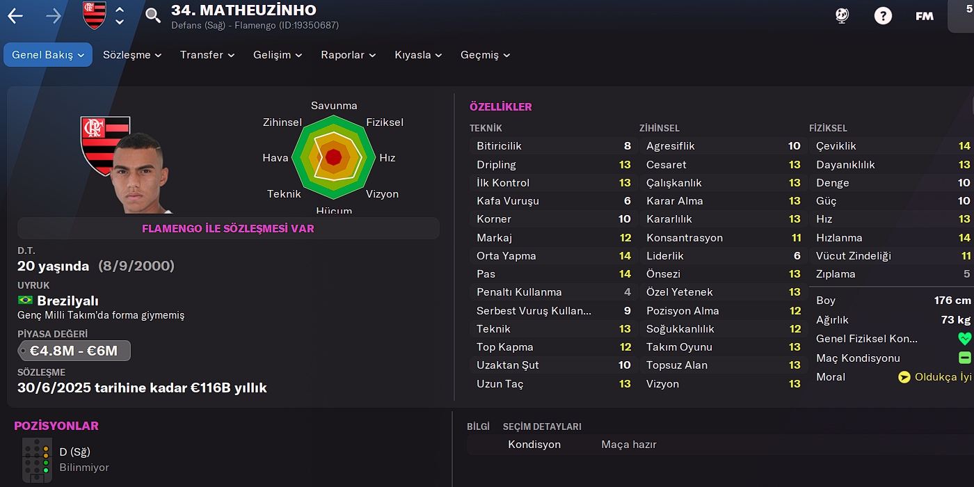 Matheuzinho oyunun iki yönünü de rahatlıkla kaldırabilen komple bir bek olarak öne çıkıyor, oyuncunun en bariz dezavantajları denge ve güç olarak göze çarpıyor.