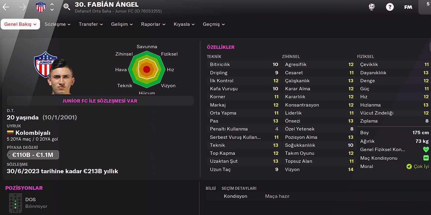 Fabian Angel oyunun iki yönünü de rahatlıkla oynayabilen takımın gerideki tempo ihtiyacını karşılayan bir ön libero, oyuncunun en bariz dezavantajları zıplama, top sürme ve özel yetenek olarak göze çarpıyor.
