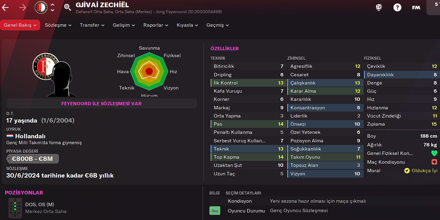 Zechiel ilk kontrol, teknik ve pas özellikleriyle oyuna yön vermeyi seven bir ön libero, oyuncunun en belirgin dezavantajları konsantrasyon, topsuz alan, top sürme ve güç olarak göze çarpıyor.