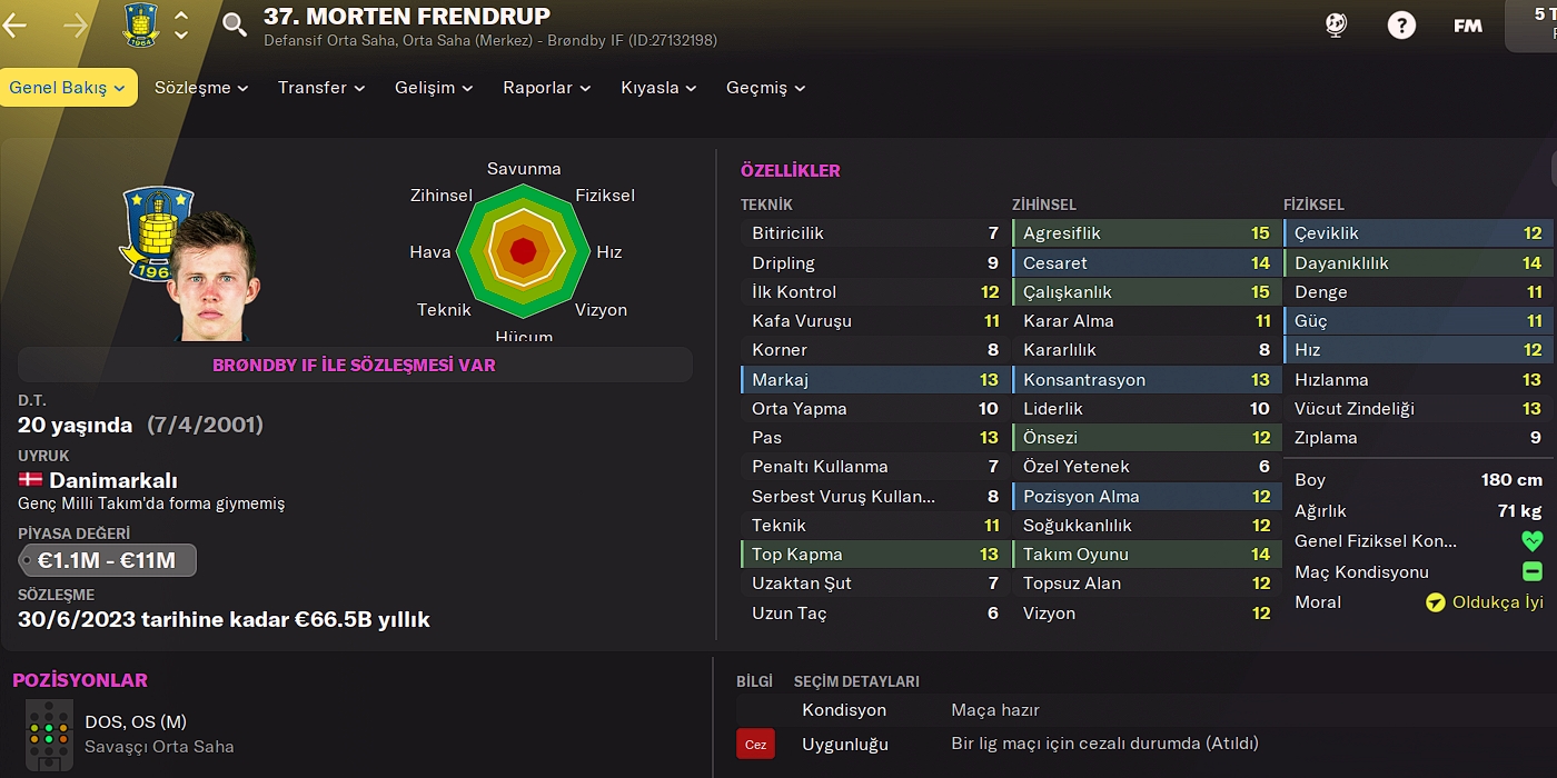 Morten Frendrup etkili savunmasının yanında topla arası oldukça iyi olan bir ön libero, oyuncunun en bariz dezavantajları zıplama ve kararlılık olarak göze çarpıyor.