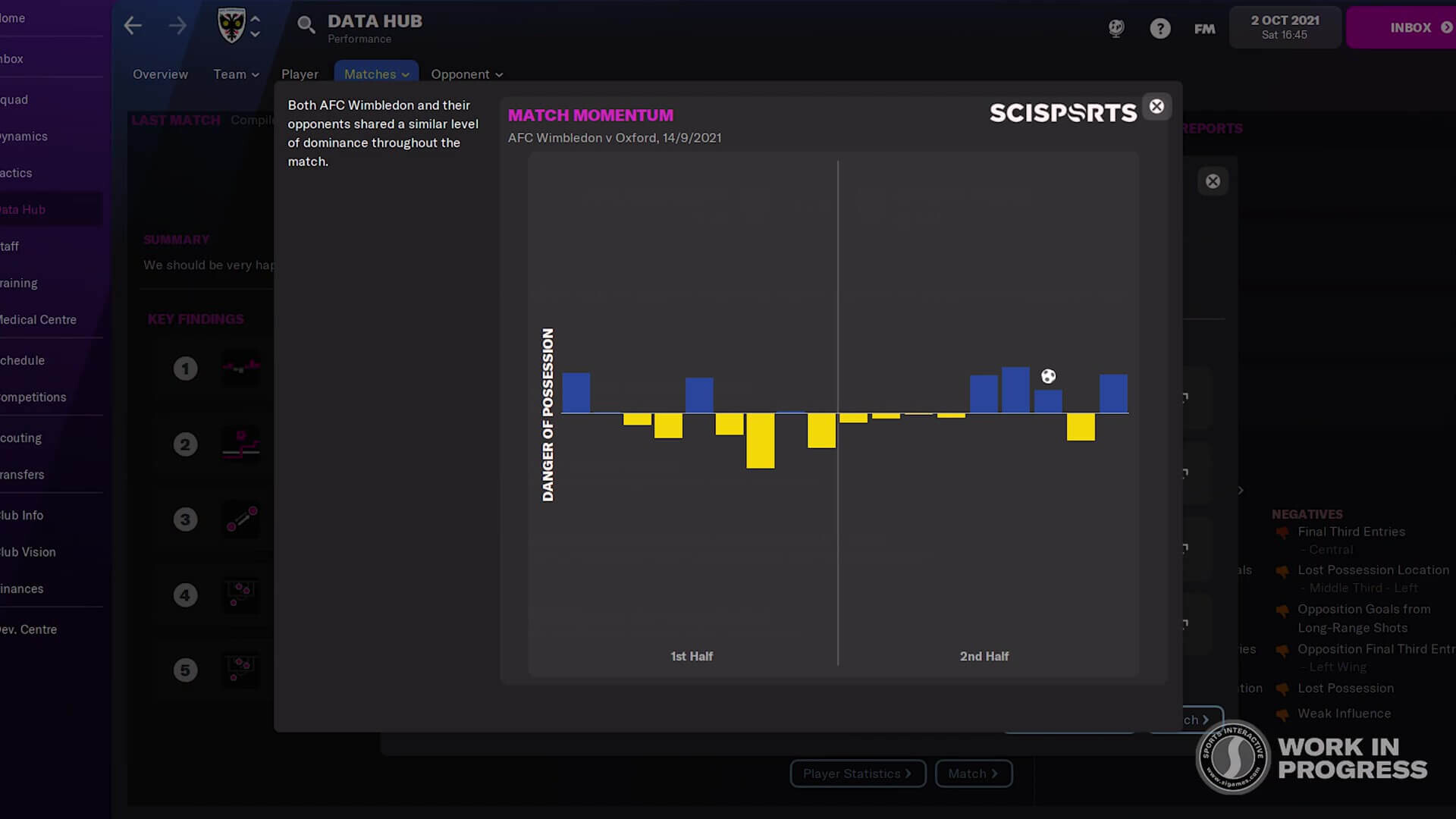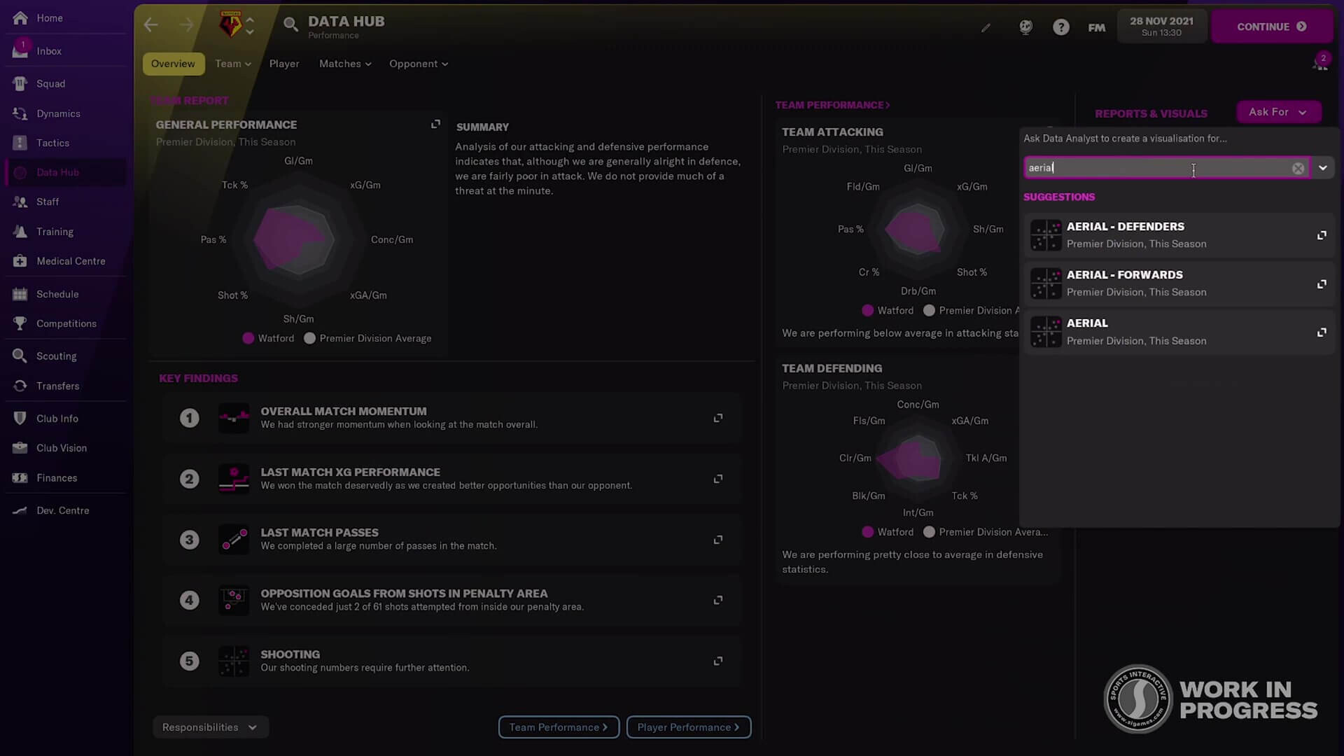 Veri futbolun da artık çok fazla içinde. Opta verileri, antrenman verileri, rakip analizi derken bir bakmışız ki sağımız solumuz veri. Football Manager da futbolun bu gittiği yolu gayet güzel bir şekilde görerek, geçtiğimiz sene zenginleştirmiş olduğu veri kabiliyetlerini tek bir merkezde toplamaya karar vermiş. Data Hub adını verdikleri – biz buna Veri Merkezi diyelim- yeni bir menüden artık tüm verilere çok daha kolay bir şekilde erişebileceğiz. Maç içi raporlar, genel durum değerlendirmesi, son maçtaki paslar, gol beklentisi gibi detaylı veriye buradan ulaşabileceğiz.