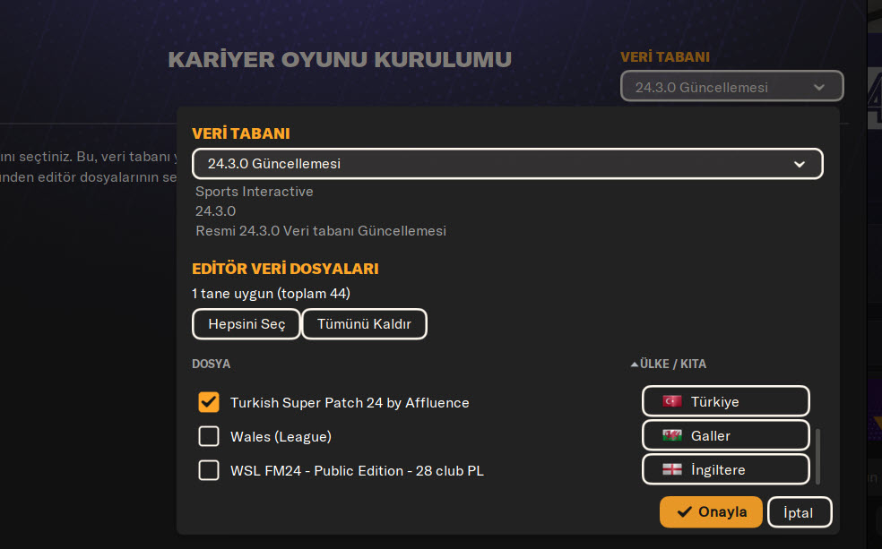 3) Football Manager 2024’e giriş yapın ve yeni bir kariyer açın. Kariyer açtığınızda veritabanı seçim ekranında Editör Data dosyalarından eklemiş olduğumuz yamayı seçin.