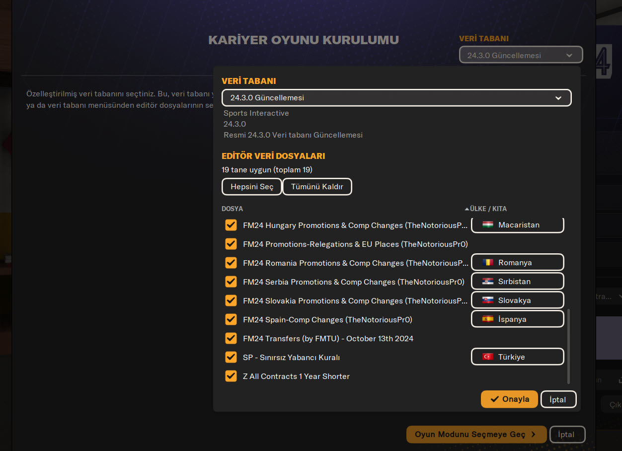Oyuna giriş yapmadan önce karşımıza çıkan Veri Tabanı seçim ekranında Editör Veri Dosyalarını seçmeniz gerekiyor. Gelen ekranda az önce kopyalamış olduğumuz dosyayı seçiyoruz ve “Onayla” diyoruz. Diğer yama yapımcılarının FM 2024 güncel transfer yamalarına kesinlikle göz atın (Diğer FM 2024 transfer güncellemelerine buradan ulaşabilirsiniz)