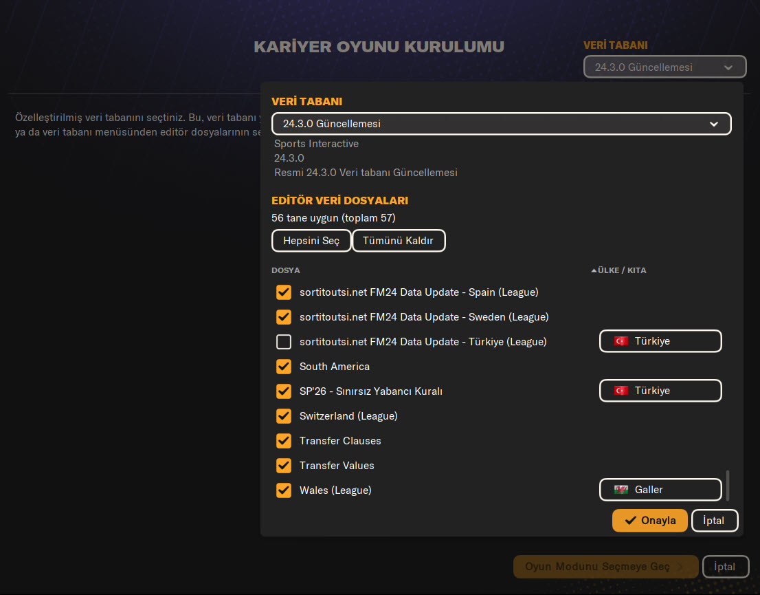 - Sortitoutsi’nin Türkiye dosyasıyla sınırsız Türkiye ligi yamasının çakışmaması için ekran görüntüsünde görüldüğü gibi FM24 Data Update – Türkiye (Leage) dosyasının yanındaki tik işaretini kaldırın.