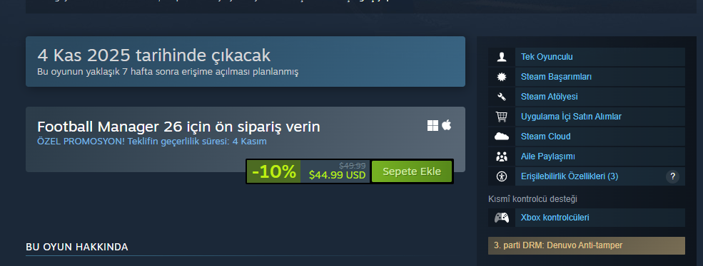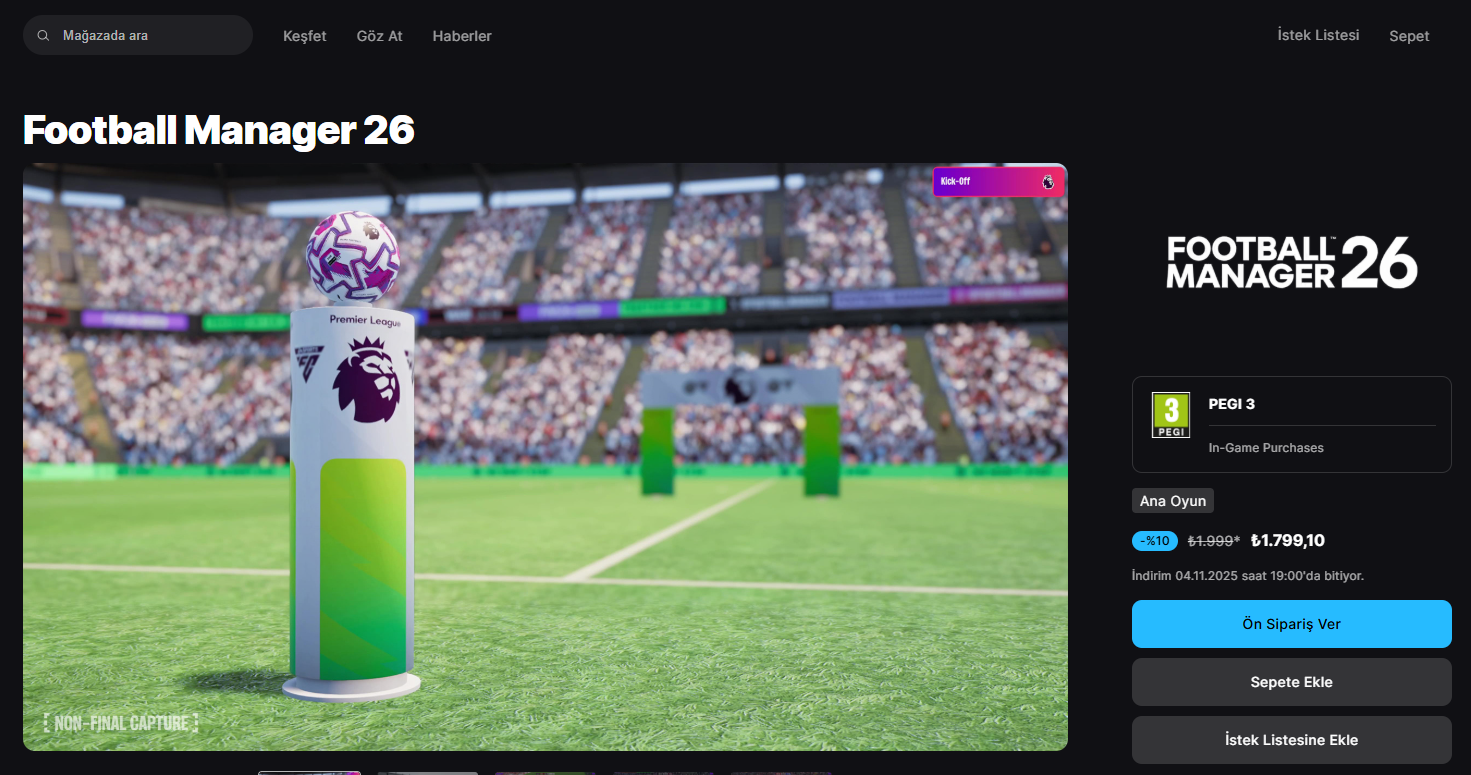 Football Manager 26’nın 4 Kasım’da full sürümünün yayınlanacağının duyurulmasıyla birlikte Steam ve Epic Games’te ön siparişe de açıldı. Steam’de TL üzerinden artık oyun alınamadığı için oyun dolar fiyatlamasıyla satışa sunulurken Epic Games’te TL üzerinden ön siparişe açıldı.