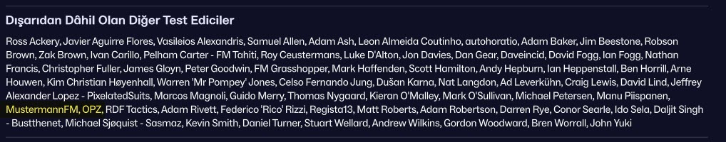 FM26 tema çalışmalarına geçmeden önce FM26’da Emeği Geçenler bölümüne göz attığımızda Football Manager serisine yaptığı tema çalışmalarıyla dikkat çeken isimlerin yer aldığı dikkatimizi çekti. FM24’ün dışarıdan dahil olan diğer test ediciler bölümünde yer almayan bazı yama yapımcıları FM26’nın test sürecinde yer almış gözüküyor. (FM24’te TCS Skin yapımcısı Tom Westwood vardı)