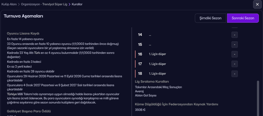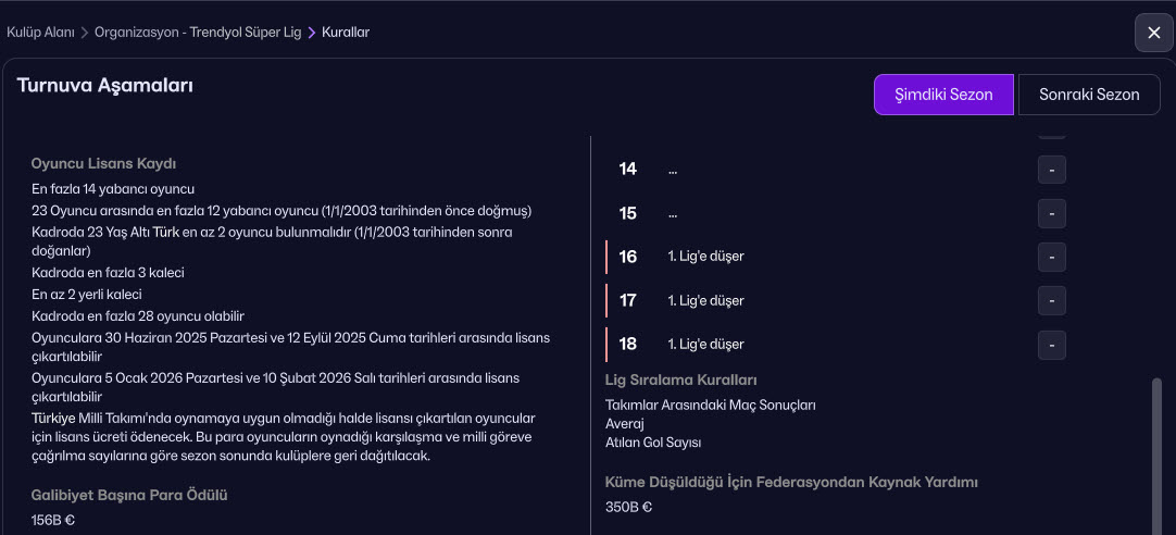 TFF’nin duyurmuş olduğunu yeni yabancı sınırının 2025-2026 sezonu ve 2026-2027 sezonunda Football Manager 26’da Süper Lig Kurallar bölümünde yer alıyor. Süper Lig kariyeri yaparken TFF’nin yabancı sınırı limitine takılmak istemeyen Football Manager oyuncuları için merakla beklenen “Yabancı Sınırı Kaldırma – Sınırsız Yabancı” yaması çıktı.