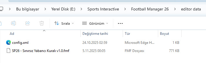 İndirmiş olduğunuz fmf dosyasını C:\Users\Kullanıcı Adı\Documents\Sports Interactive\Football Manager 26\editor data klasörü içerisine kopyalayınız. (Belgelerim\Sports Interactive\Football Manager 26\editor data)