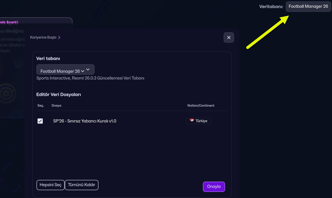 Selim Atalay nam-ı diğer Sinyor Selim’in Türkiye Ligleri için yapmış olduğu FM 26 yabancı sınırı kaldırma yaması, FM 26’da sınırsız yabancıyla kariyer yapmanıza imkan sağlıyor.
