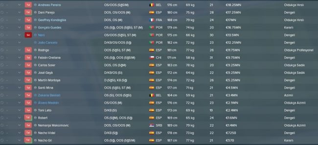 Kadro derinliği anlamında orta sahaya baktığımız zaman sayısal olarak ve çeşitlilik anlamında belirlenen hedefe göre yeterli buluyorum. Tek sıkıntı, eldeki oyuncuların FM geçmişlerini hatırladığım zaman istikrarsız oluşları. Bu da iyi bir taktik ve doğru antrenman programı ile en aza indirilebilir. Orta sahada United’tan kiralık Pereira, takım kaptanı Parejo ile iyi bir ikili olabilecek yapıda bir oyuncu. Arkalarını sağlama almak adına Kondogbia’nın performansı burada önem kazanacak. Sol açık ve sağ açık pozisyonları için santrofor pozisyon bilgisi oyuncuların kadroda olması büyük bir avantaj. Genelde bu tarz oyuncuların bitiricilik özelliklerinin yüksek olması, 4-3-3 gibi sık kullanılan taktklerin işlemesi adına kilit nokta olmaktadır. Pereira’nın kiralık olması sezonun devamında Carlos Soler’in rotasyona sokulması gerekliliğini doğurabilir. Nitekim yapılacak bu değişiklik ile gelecek sezona gelişimi hızlanan bir Soler vadetmekte.